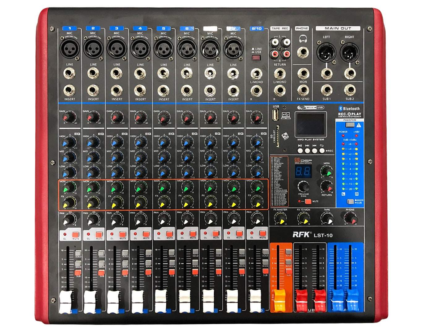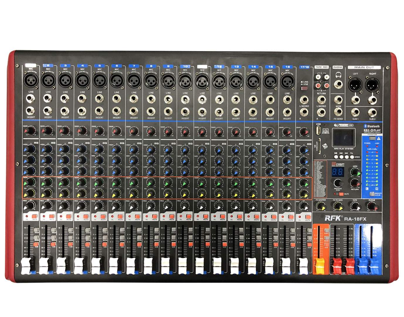 *每路輸入通道MUTE靜音開關,SOLO耳機開關,平滑60MM行程推子器;